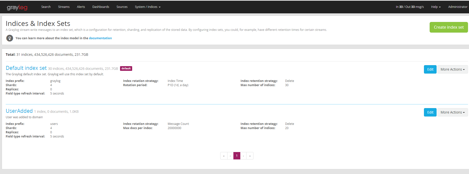 I’m using the “default Index set”, (Shards:4, Index rotation strategy: Index Time, Index retention strategy: Delete, Max number of indices:30)