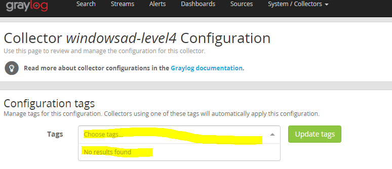 I have an installed new graylog 2.5 server. When creating the Tags, it is not updated in configuration.